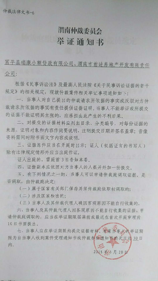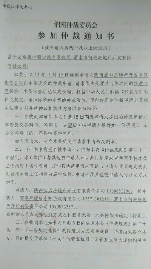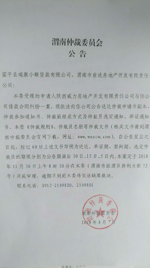 陜西威力房地產(chǎn)開發(fā)有限責(zé)任公司與富平縣瑞康小額貸款有限公司、渭南市前進(jìn)房地產(chǎn)開發(fā)有限責(zé)任公司一案公告