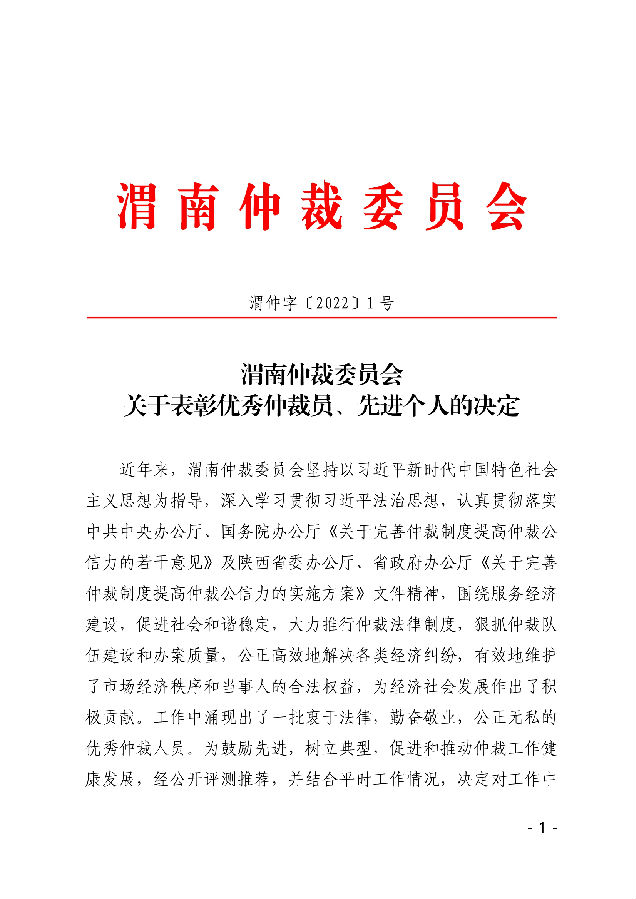渭南仲裁委員會(huì) 關(guān)于表彰優(yōu)秀仲裁員、先進(jìn)個(gè)人的決定