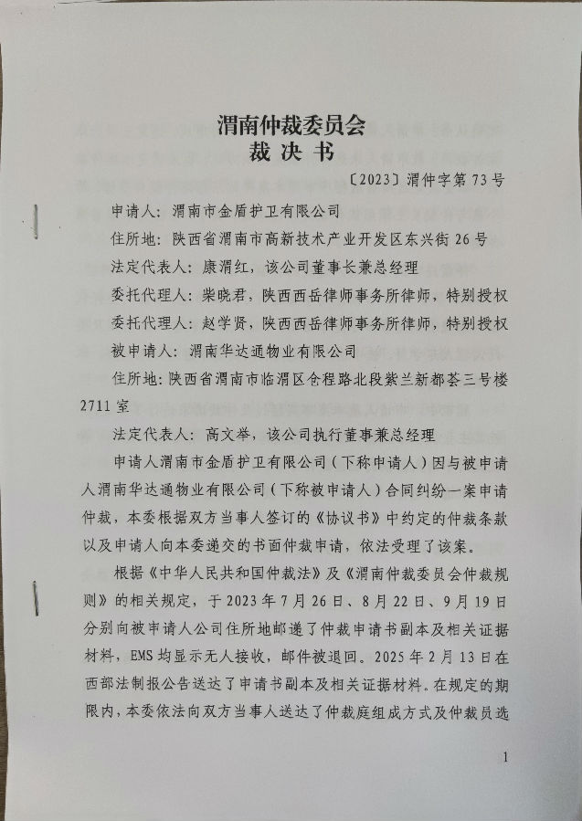 渭南市金盾護(hù)衛(wèi)有限公司與渭南華達(dá)通物業(yè)有限公司合同糾紛案公告